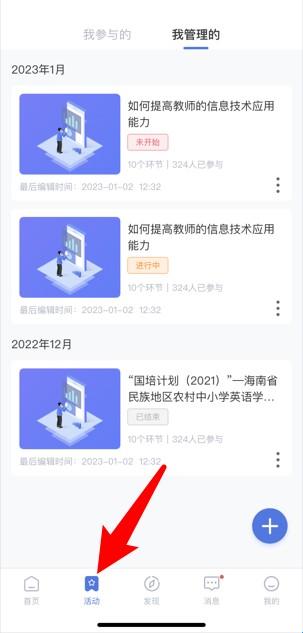 2、点击底部“活动”进入管理页面,可查看我参与或我管理的所有培训课程与状态。