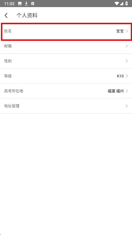 3、在个人资料页面里,找到姓名选项并点击,进入修改姓名界面。