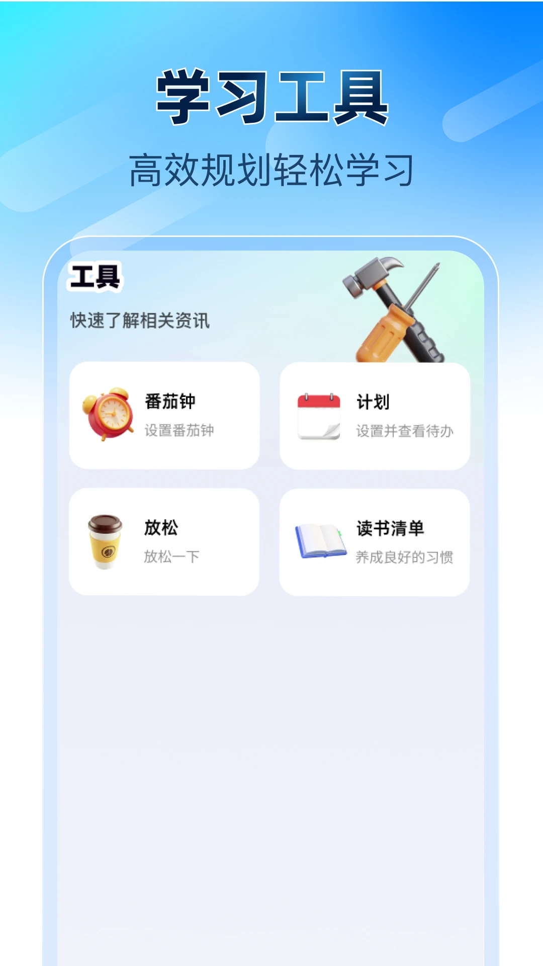1、除了备考资源与资讯,还包含番茄钟、计划表等,可帮助用户科学管理备考时间,养成良好学习习惯,提升时间利用效率。