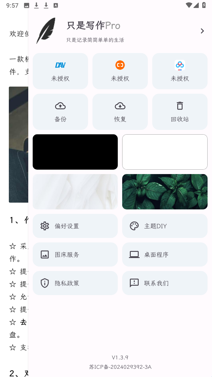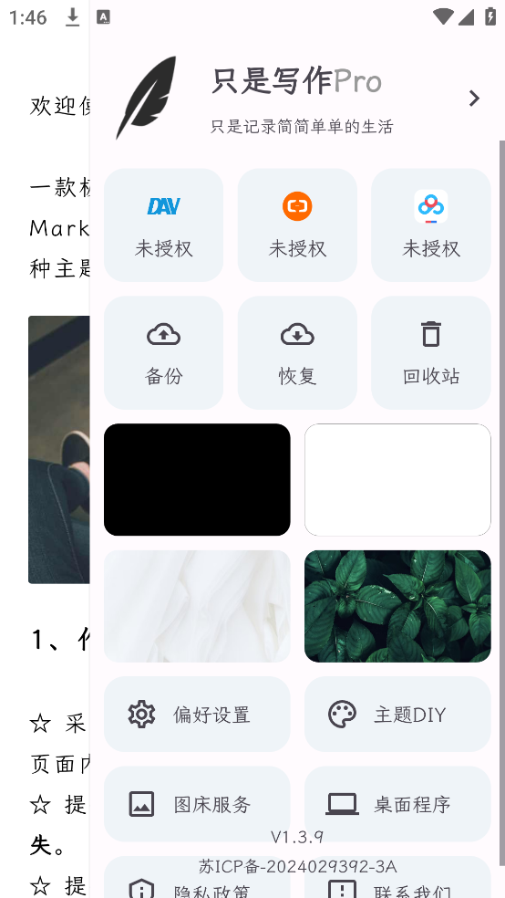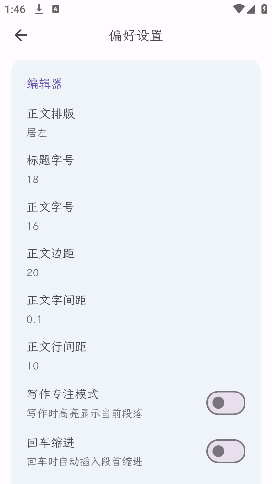 3、往左滑动主界面则会显示设置菜单,可调整字体、背景等个性化写作参数。