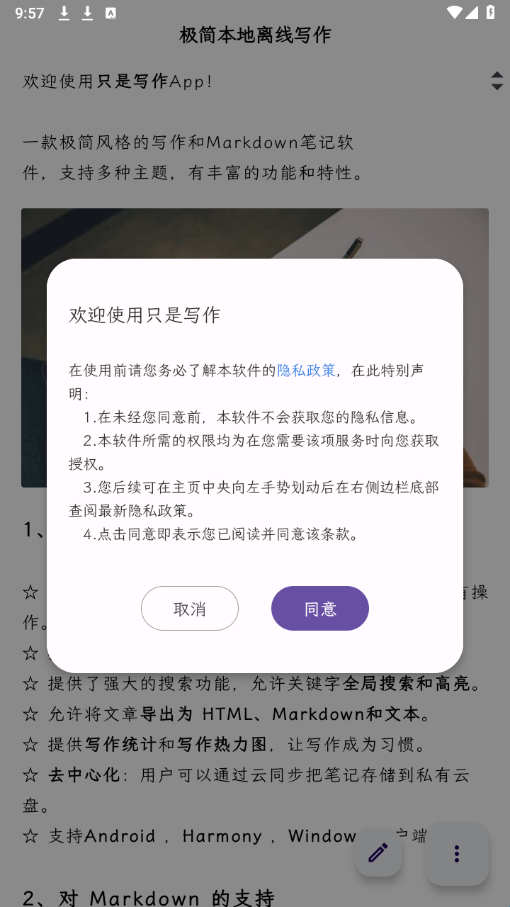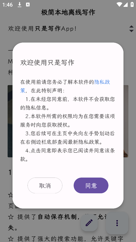 1、首次启动需阅读隐私条款,确认同意后即可进入简洁清爽的创作主界面。