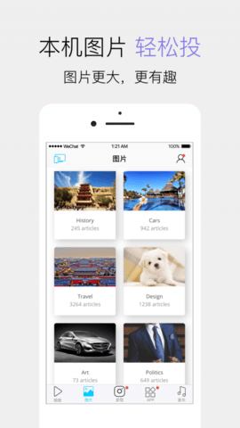 3.投文件:支持本地手机中的照片.音乐.视频投射到大屏中,让客厅大屏电视,成为家庭共享中心,与家人朋友分享快乐