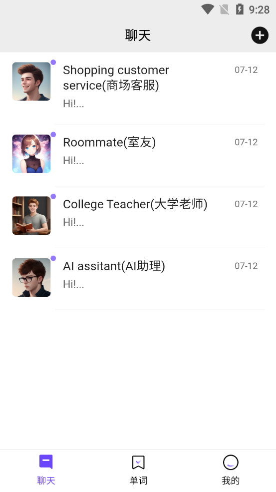 2、语音输入和智能回复:支持语音输入,随时练习口语。真实的英文聊天环境,陌生单词标注随时查看。