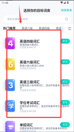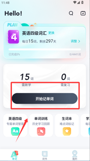 1、打开应用后选择目标词库,如四级或高职单招词汇,设定每日学习量开始记忆任务。