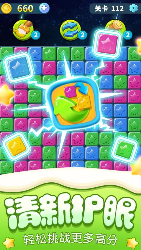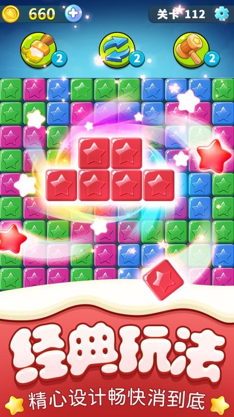 1、游戏采用经典的三消玩法,通过点击相邻的同色星星完成消除。简单的操作规则让新手也能快速上手,消除特效华丽流畅。