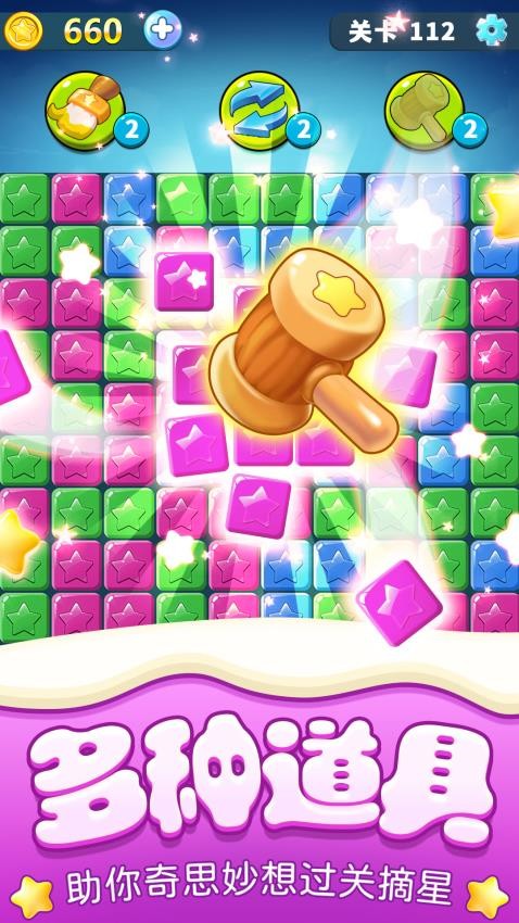 3、设有多种实用道具,包括可随机重排棋盘的打乱工具、改变单个星星颜色的调色工具以及直接清除指定方块的锤子工具。