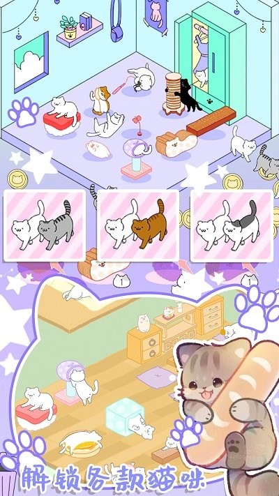 2、解锁更多有趣的内容,不断和猫咪们互动,提升你们之间的亲密度,解锁更多玩法。