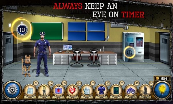 收集监狱牢房中的可用物品并解决迷你谜题以打开锁定并从囚犯级别收集一些钱。