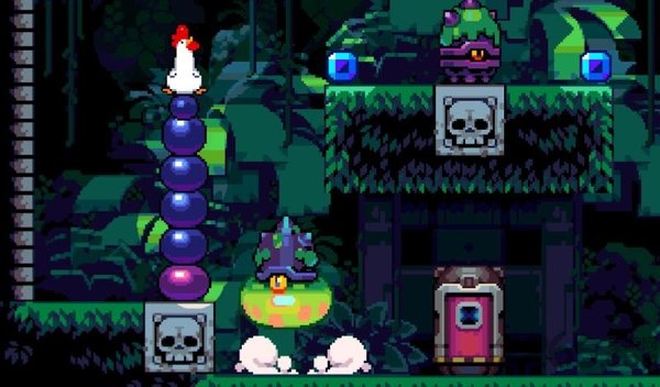 游戏中玩家控制着会下炸弹的可爱小白鸡,炸弹的功能非常多,你把炸弹踢出去能消灭敌人,炸弹能够触发机关发现隐藏关卡,还能够炸开墙壁找到通关道路,炸弹一直堆叠起来能让你到达很高的地方,来通过复杂的关卡设计,总之炸弹鸡没有了炸弹就只是烤鸡了,可见炸弹有多重要。