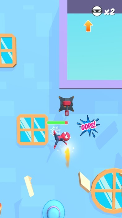 1、通过点击屏幕控制蜘蛛侠发射蛛丝进行移动与跳跃躲避敌人攻击。