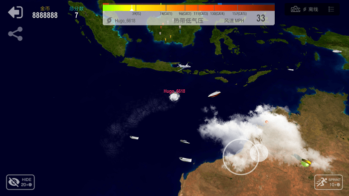 陆地有应对防范措施,他们会发射导弹消减你的能量,所以在你还不够强大时,尽量远离陆地,前往海面上寻找更多的资源,完成成为终极飓风的目标。