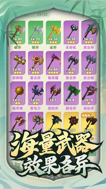 几十种奇葩武器任你抽选——会拐弯的回旋斧、爆炸输出的雷神锤、甚至能召唤竹子的“笋之怒”!不同武器不同策略,每一局都有新鲜体验!