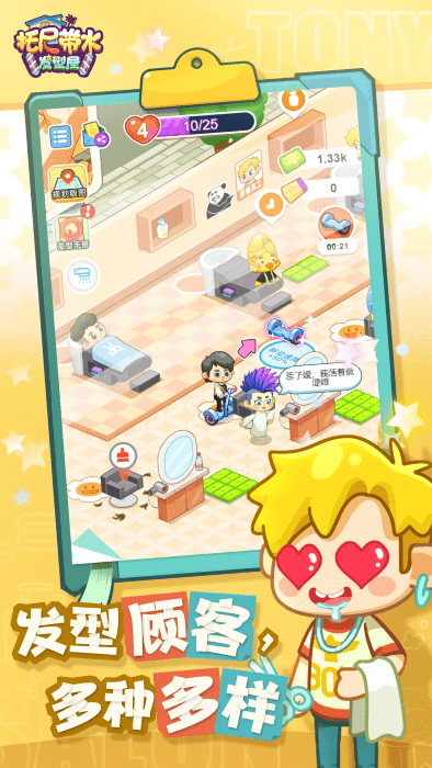 托尼带水发型屋小游戏经营一家理发店,你作为店主需要的就是经营管理好你的店铺,需要建立各种设备,招募理发师帮助,吸引更多的用户前来剪头发,成为美发大亨,游戏的整体过程很轻松好玩,一起来这里看看吧!