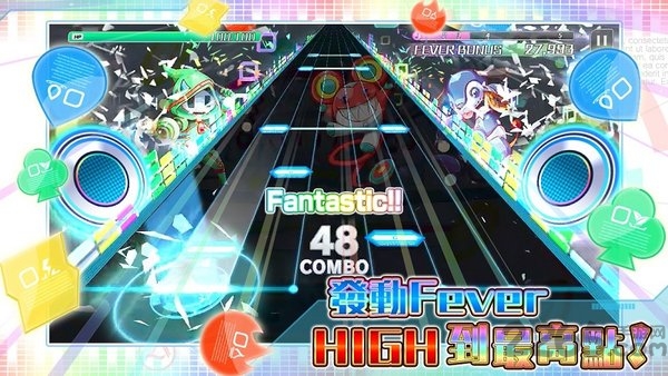 在游戏中的特定区段,只要能准确跟上节奏,就可发动让乐曲HIGH到最高的Fever Mode!