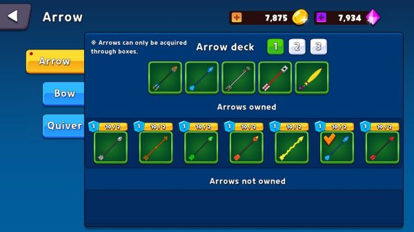 收集和升级物品。各种箭头,例如火,冰,闪电,炸弹,混乱和透明度。