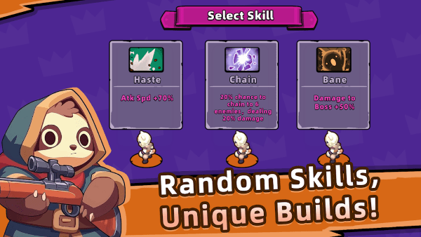脾气暴躁的犬圣骑士、笨手笨脚的熊猫丘比特、打瞌睡的树懒神射手……数十位造型奇特、令人惊艳的动物佣兵等待你的指挥!每位佣兵都有独特的攻击风格和角色。快来打造你的终极动物军团吧!