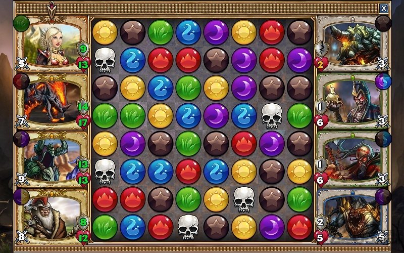 5.游戏中共分为六种颜色的宝石(红色、黄色、蓝色、绿色、紫色、棕色)以及骷髅,玩家和对手依次进行消除,消除3个同色的宝石获得3点该色的宝石能量,4个四点能量、5个五点能量依次类推。