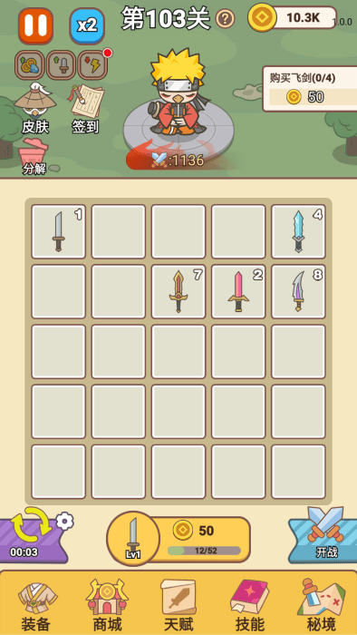 宝剑合成:通过简单的拖拽操作,将两把相同等级的宝剑合成为更高级的宝剑。合成后的宝剑拥有更强的攻击力和更高的飞舞速度,帮助你轻松应对各种挑战。