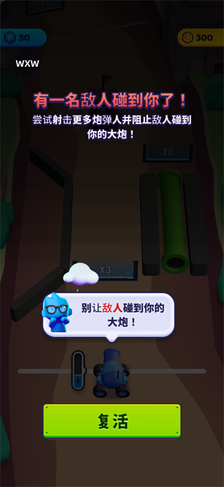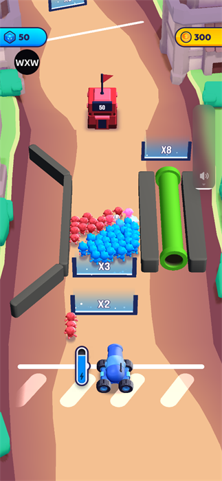 2、按住大炮不松手就可以源源不断地发射出炮弹人,炮弹人经过倍数门会获得数量上的增长,建议朝着倍数较高的门发射。