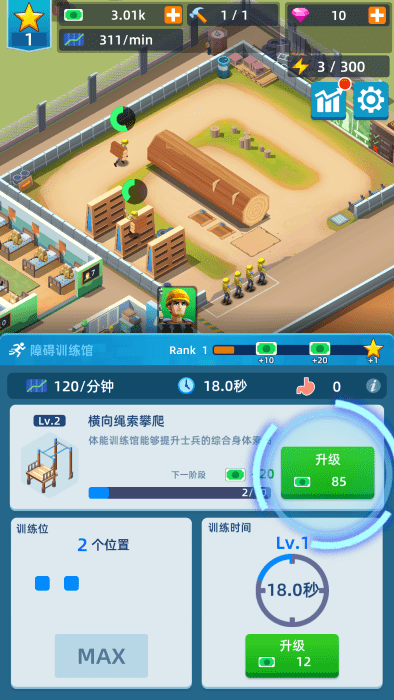 多种训练场等你解锁!打靶训练、障碍训练、靶场训练、城市作战训练、拳击训练、手榴弹射击训练、火炮训练、坦克训练……你都可以在这里找到。您需要做的就是点击并升级它们。明智地投资,用你的资金发展你的基地,解锁训练计划,提高你的声望,扩大你的军队,建立一个强大的军事和商业帝国!