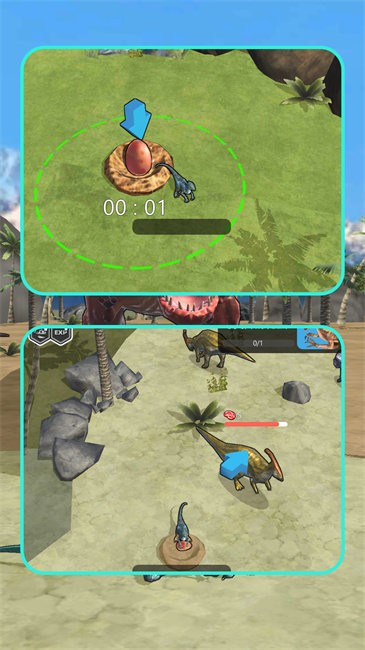 1、玩家可以通过探索收集不同种类的恐龙蛋,孵化并训练它们。