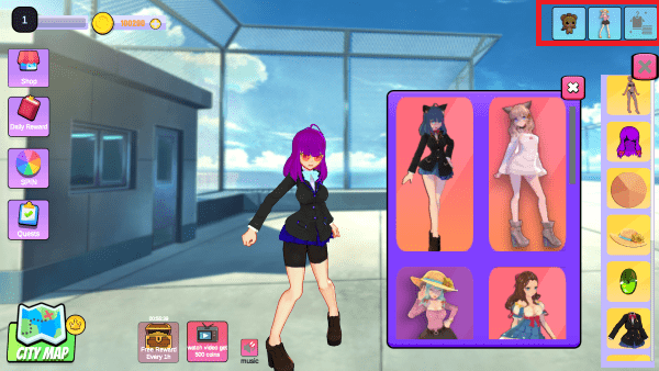 当你下载游戏后进入,你可以看到这些界面,右上角就是人物形象与服装更换的界面,左下角是地图打开。