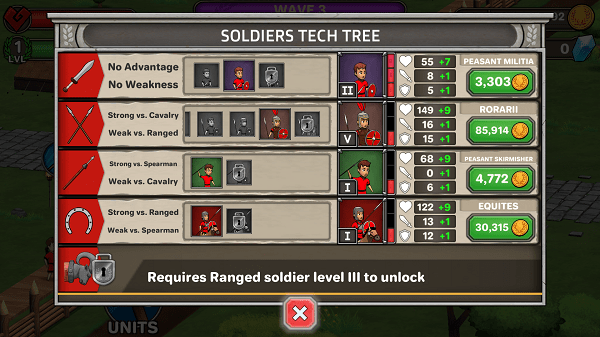 升级部队可以增加部队攻击力并解锁更多兵种,兵种有各自的特性并且存在克制关系,游戏有多种部队,如禁卫步兵、重装步兵、标枪步兵等