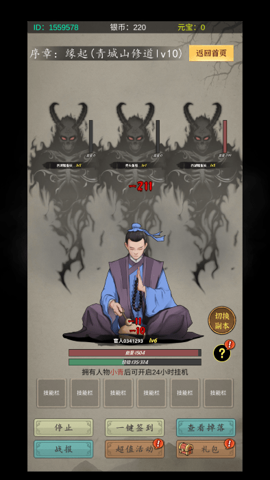 打怪都是自动的,点击技能栏可以进去装备技能,一键签到获得奖励,随着等级随时切换副本战斗。