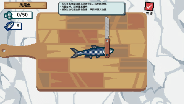 从左到右滑动屏幕来使用你的刀刮鱼鳞。道具越好,刮的越快,同时也不会伤了鱼体,价值也会越高。