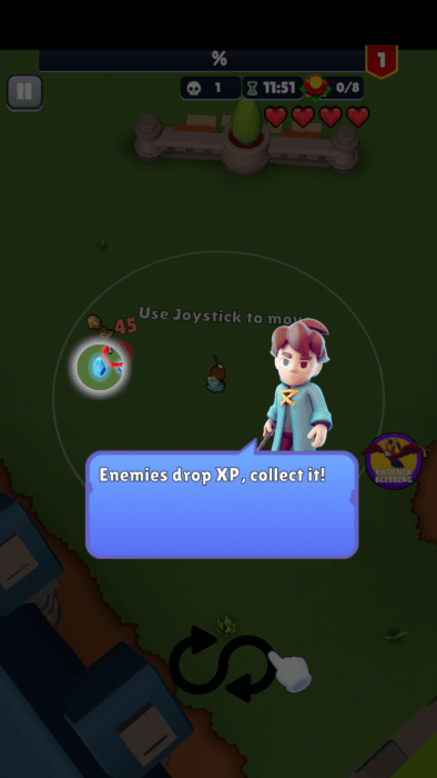 自动攻击怪物,掉落的经验需要移动过去拾取。