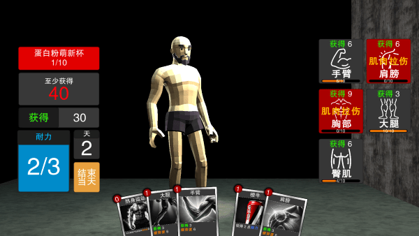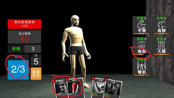 你可以看到下方是锻炼的卡牌,右边是你每个锻炼部位的数值,不要全部消耗掉了。