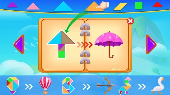 4、通过七巧板拼搭机制解谜闯关,利用智慧拼出指定图案突破障碍,逐步推进梦幻冒险旅行的主线进程。