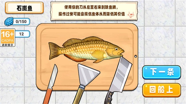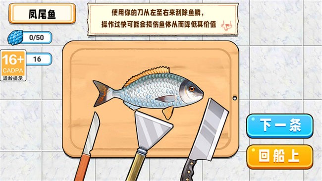 2、使用专用刀具处理捕获的鱼类,掌握刮鳞技巧保持鱼肉完整,获得更高处理评分。
