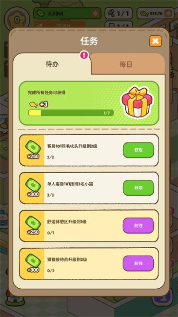《我的完美猫酒店》是一款可爱的模拟经营类游戏。你在其中管理一家拥有客房、餐厅和健身房的猫咪酒店。所有员工和客人都是猫,拥有超级猫等特殊角色。定制,营造舒适的氛围,确保客人开心。在这个令人愉快的猫管理游戏中体验快乐。