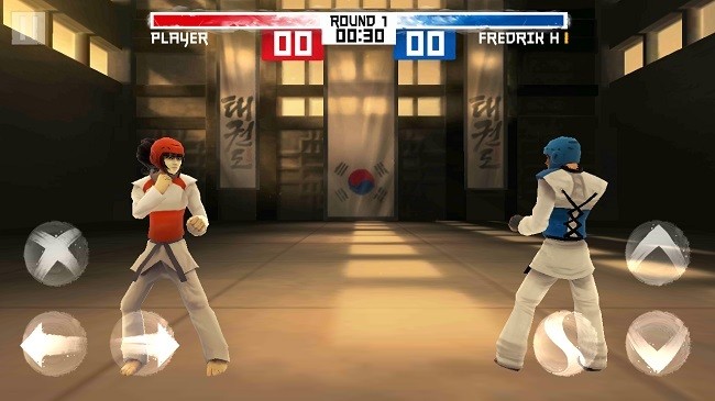 游戏中玩家通过屏幕按键来控制选手的移动、格挡和踢腿等动作,而多次踢中对手头部就是比赛的制胜点。