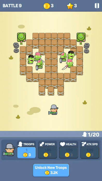 探索众多关卡,每个关卡都有自己的布局和僵尸攻击模式。调整你的策略并移动你的塔战士来对抗不同类型的僵尸并克服复杂的挑战。idle tower: warrior defense为您提供了不同的有趣主题,所以让我们尝试积累您的星星来克服所有关卡。