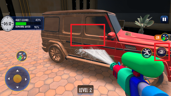 打开你的高压水枪对准汽车进行冲洗,你还能切换水枪喷水模式。