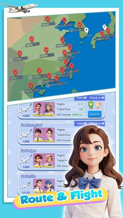 拓展航线至多个城市,如香港、新加坡、上海、东京等,城市不断更新。探索投资目的地城市,解锁众多城市设施,发现城市特色地标!