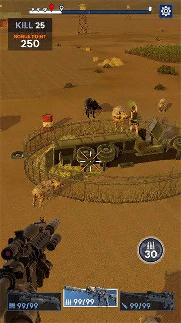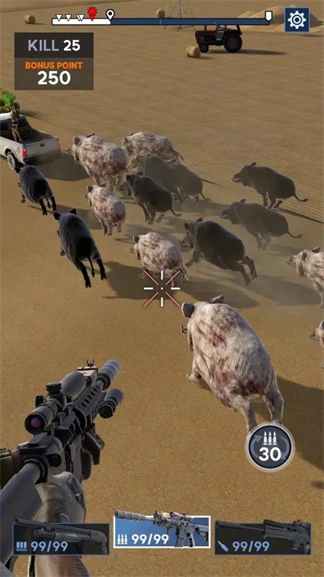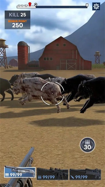 直升机狩猎安卓版玩家在游戏中将化身为一名狙击手,在这里你将通过射击的方式来击杀不断来袭的动物。面对野猪入侵,该出手时就出手,不要让它们对你造成威胁,还有各种武器可供改造升级。