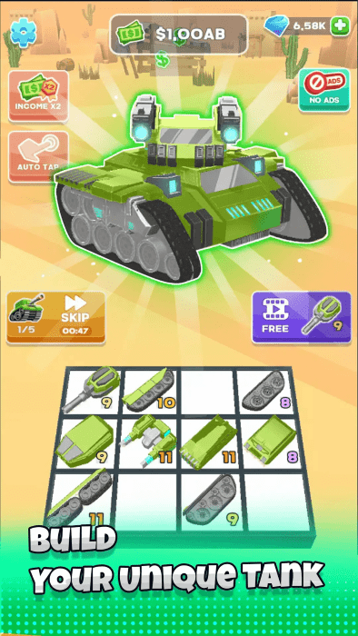 闲置合并坦克大战最新版完成你的坦克大战,在这里你可以结合你的创造力和对行动的热情来建造你独特的坦克,合并坦克部件并升级,为即将到来的战斗做好准备。建造自己的坦克的乐趣,以及解锁新可能性的兴奋。