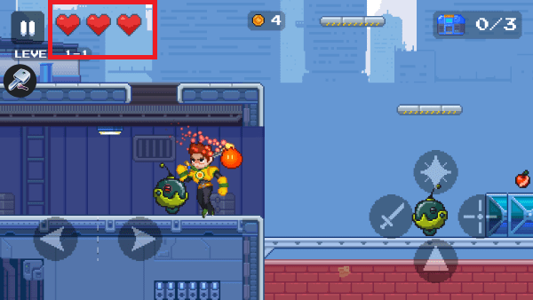 进入到游戏关卡中,主要你只有三颗心,不要被怪物攻击到了,地图有苹果拾取,补充血量。