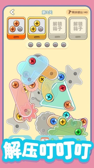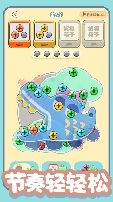 螺丝全拧掉最新版是一个消除的螺丝游戏!你需要快速准确地拆掉螺丝,将它们放入同颜色的箱子里。随着每一个螺丝的消失,彩色玻璃会缓缓滑落,快来螺丝全拧掉,释放你的压力,展现你的技巧,成为真正的螺丝消除大师吧!