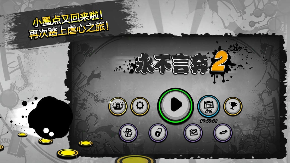永不言弃2最新版本已上线,小墨点又回来啦,再次踏上虐心之旅吧!这款风靡世界的节奏游戏第二代终于来到了大家面前。游戏依然延续经典的一键式操作,跟随音乐的节奏点击屏幕,跳过尖刺、高台和更多新障碍;18个全新设计的关卡,3种难度,让所有玩家都能找到适合自己的路线!除了最受大家喜爱的小墨点,小墨点家族又增添24个全新的角色,依然可以通过经典的扭蛋机系统全部摇出来,总有一个让你倾心;在这个充满致命尖刺和高台的独特超现实水墨世界里,与小墨点以及它的朋友们一起跳跃吧!