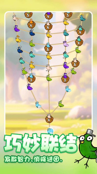 鸡飞蛋不打最新版提供好玩有趣的消除类游戏。玩家通过点击绳子网最边缘的小鸡让小鸡把鸡蛋丢到对应颜色的窝里,当窝满了就会孵化出可爱的小鸡宝宝。