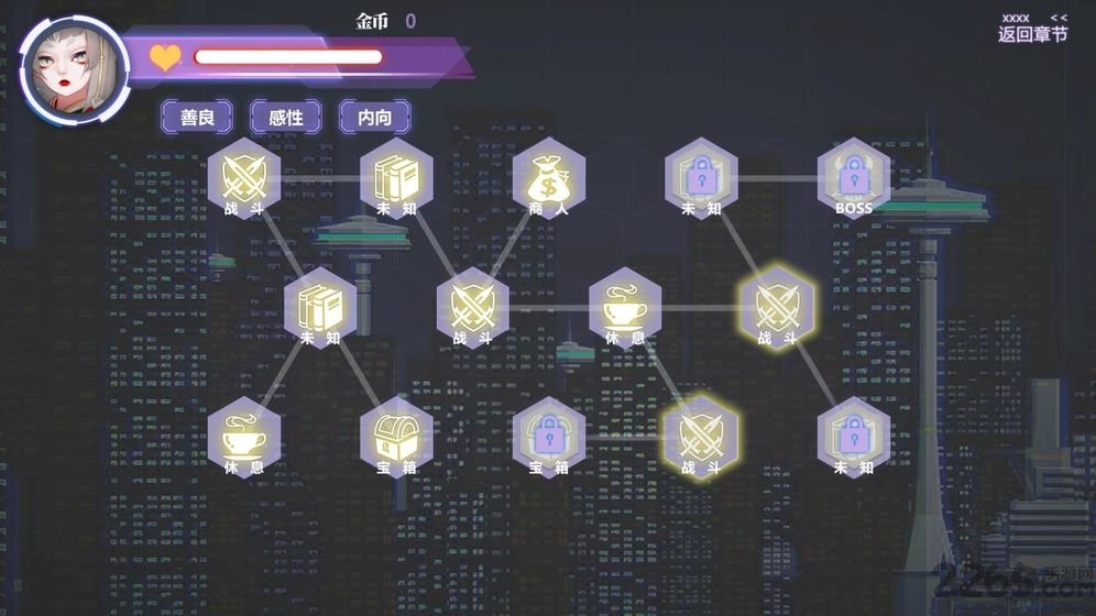 半Roguelike流程,地图固定,关卡事件部分随机(选项数量不尽相同),具有简单的局内成长,死亡后会重新开始。