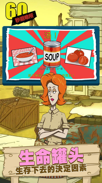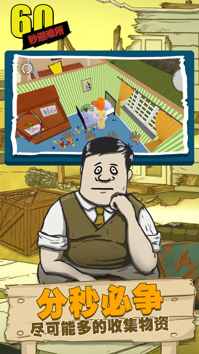 60秒避难所最新版是一个非常有趣又好玩的手机模拟生存冒险类型的休闲末世题材的趣味游戏。在游戏中玩家将在这个末日世界进行顽强的生存,玩家需要在规定的时间内外出寻找各种食物和物质,还需要合理的分配每个食物的分量。感兴趣的朋友们快来下载试试吧!