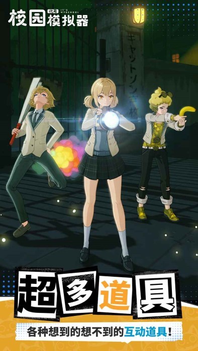 除了有像小书包、应援棒、手术刀、黑板擦、午餐便当等等五花八门的模拟道具。还有诸如香蕉枪、太阳能探照灯、喷气背包、黑暗料理等天马行空的魔性互动道具。利用这些道具,我们可以组合出超多的情景模拟!