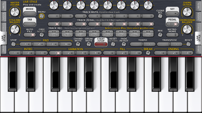 -使用以下方式模拟KORG键盘:淡入淡出,同步,键盘设置,速度,移调,八度,平衡,音调,分割,和弦记忆,点击速度/重置...