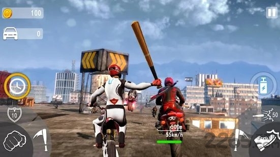 点击蝙蝠,斧头,脚踢和拳打按钮击败对手的交通自行车攻击赛车手
