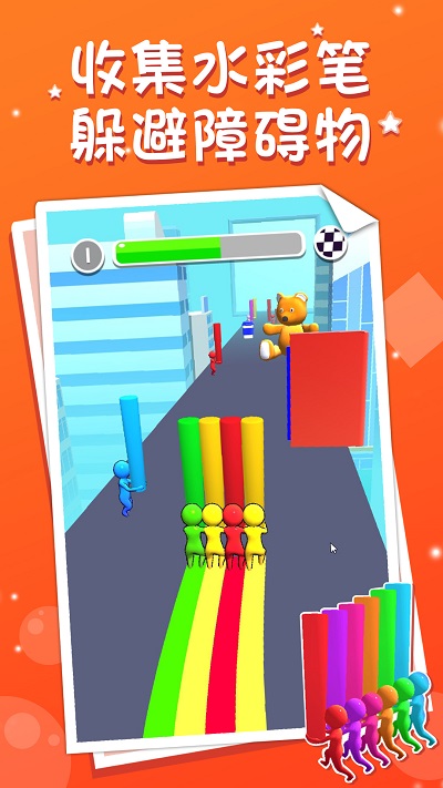 街道奔跑游戏是跑酷类的闯关游戏,有着丰富的关卡等你来体验,超多创意关卡挑战新高度,玩家能够收集水彩笔躲避障碍物,顺利的到达终点位置就行,简单地操作一秒即可上手,喜欢的小伙伴快来下载试试吧。